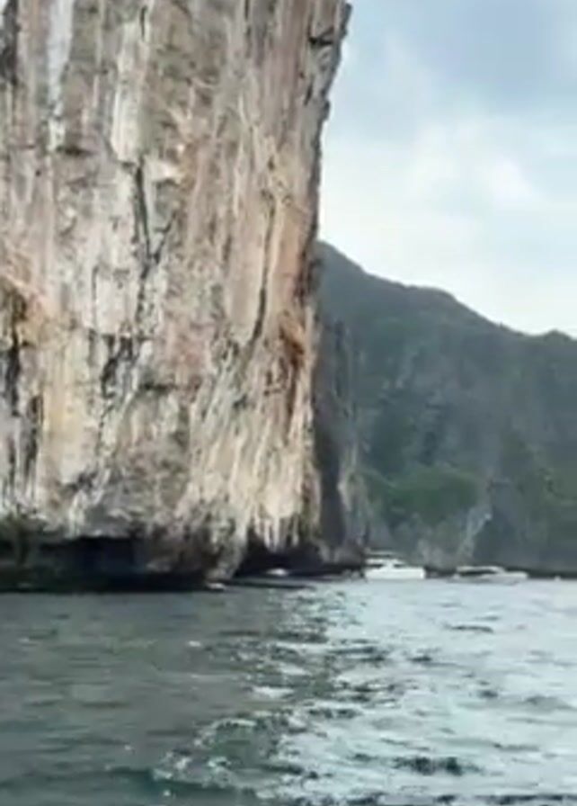 The camera travels on the water near a towering cliff face. In the background, there is a lush, green mountain range. A few boats can be seen on the water, including a white yacht, a white catamaran, and a small boat carrying two people. The sky is overcast and grey.