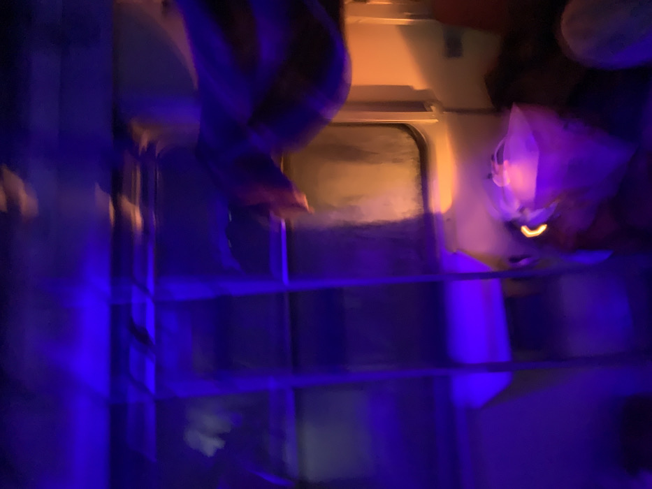 A dimly lit space with a metal grid in the foreground is illuminated by blue light. Behind the grid, a train window reflects an indistinct exterior scene bathed in golden light. A translucent plastic bag is affixed to the wall. The scene is out of focus, rendering details obscure. The composition includes the back of a person, barely discernible in the background.