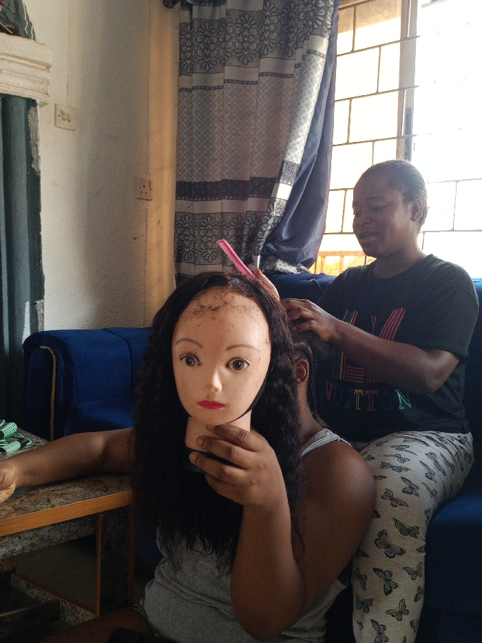 Two women are working on hair. One woman, wearing a dark t-shirt and butterfly-patterned pants, sits on a blue couch and styles the hair of another woman, who is only partially visible. The second woman holds a wig on a mannequin head with long, dark, wavy hair in front of her. A pink comb is visible in the first woman's hand. A curtain, a window, and various pieces of furniture are visible in the background.