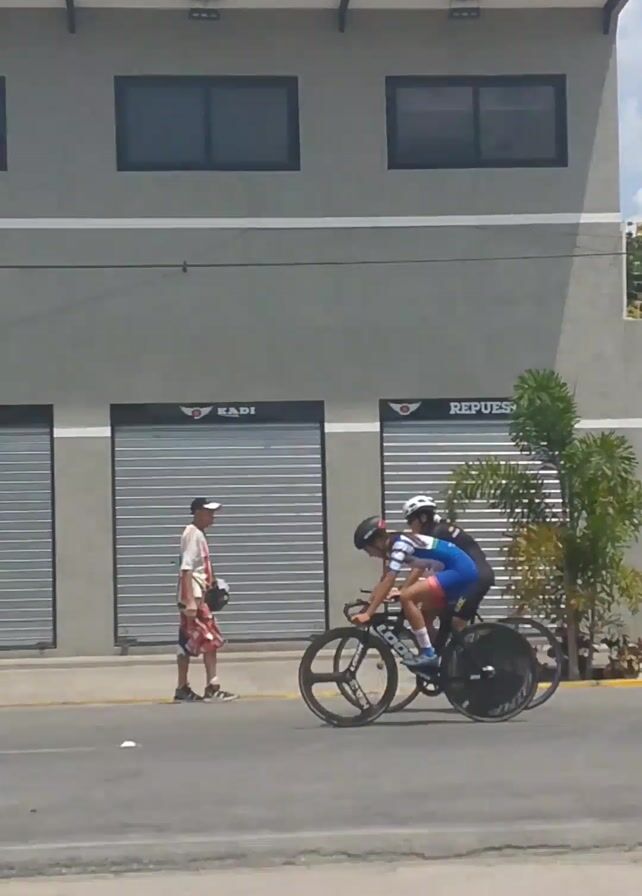 Two cyclists are riding tandem on a road in an urban environment on a sunny day. They are wearing helmets and cycling gear, with the cyclist in the front wearing blue and white clothing and the cyclist in the back wearing blue clothing. The tandem bicycle has specialized wheels, including a disc wheel in the rear. They are passing by buildings, including one that appears to be an auto parts store with the word "REPUESTOS" visible on the closed shutter. A red motorcycle is parked on the side of the road, and a person is walking on the sidewalk. The sky is partly cloudy, and there are trees visible in the background.