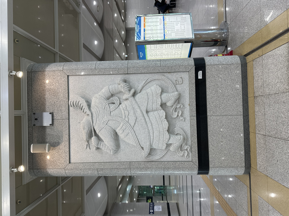 The image depicts a brightly lit interior space within Singyeongju Station in Gyeongju-si, South Korea. A prominent, rounded rectangular pillar clad in speckled light grey granite occupies the center, featuring a large bas-relief sculpture. The sculpture portrays a dynamic, anthropomorphic figure, possibly one of the Twelve Zodiac Generals, in a traditional Korean style. The figure faces left with its head turned to the right, holding a weapon resembling a short sword or club in its raised right hand. It wears ornate, layered attire and a distinctive crested headdress. Above the sculpture, a beige cylindrical speaker and a grey rectangular mounting plate are affixed to the pillar. A black horizontal strip borders the sculpture at its base. The floor is a grid of polished light grey, dark grey, and white tiles, with yellow tactile paving strips in the foreground. The ceiling is high, featuring a white grid pattern with recessed square and linear lighting fixtures. In the left background, additional pillars and a well-lit corridor with directional signage are visible. To the right, a freestanding, double-sided information display stand, mounted on a chrome base, shows grids of Korean text and numbers, likely schedules. A red fire extinguisher is partially visible behind the display. A single individual is indistinctly visible in the far right background.