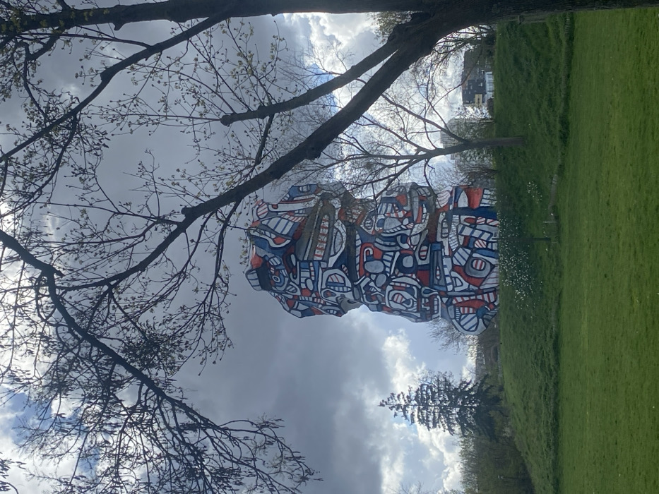 A large, multi-tiered abstract sculpture, identified as the Tour aux figures by Jean Dubuffet, is centrally positioned on a grassy mound within Parc Henri Barbusse in Issy-les-Moulineaux, France