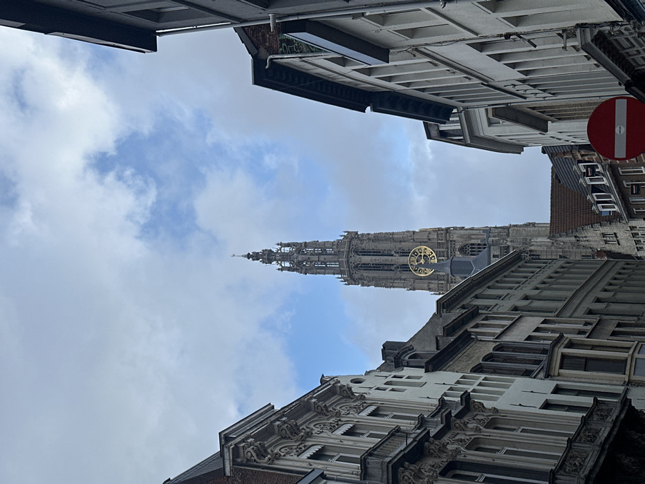 The image presents a street-level upward view of the Cathedral of Our Lady's spire in Antwerp, Belgium