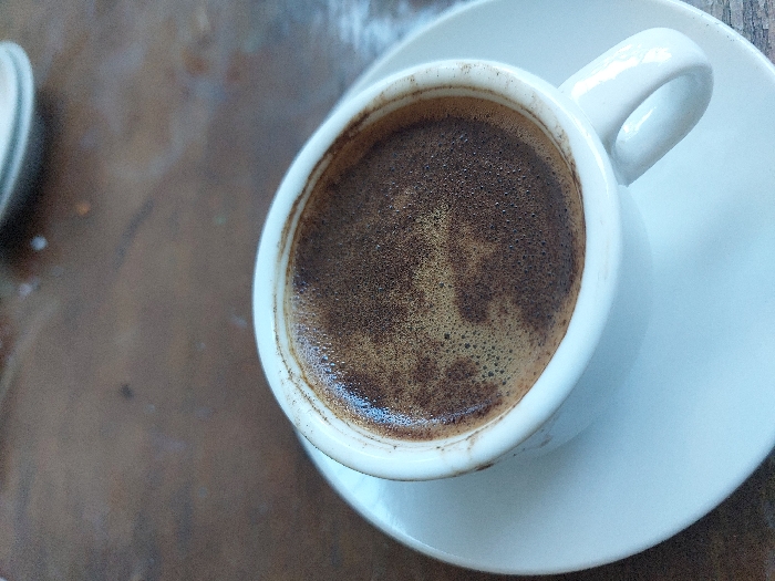 - "A white ceramic cup containing dark brown liquid with a foamy, textured surface is positioned centrally on a matching white ceramic saucer" by FM-24lPl1, licensed under CC BY 4.0