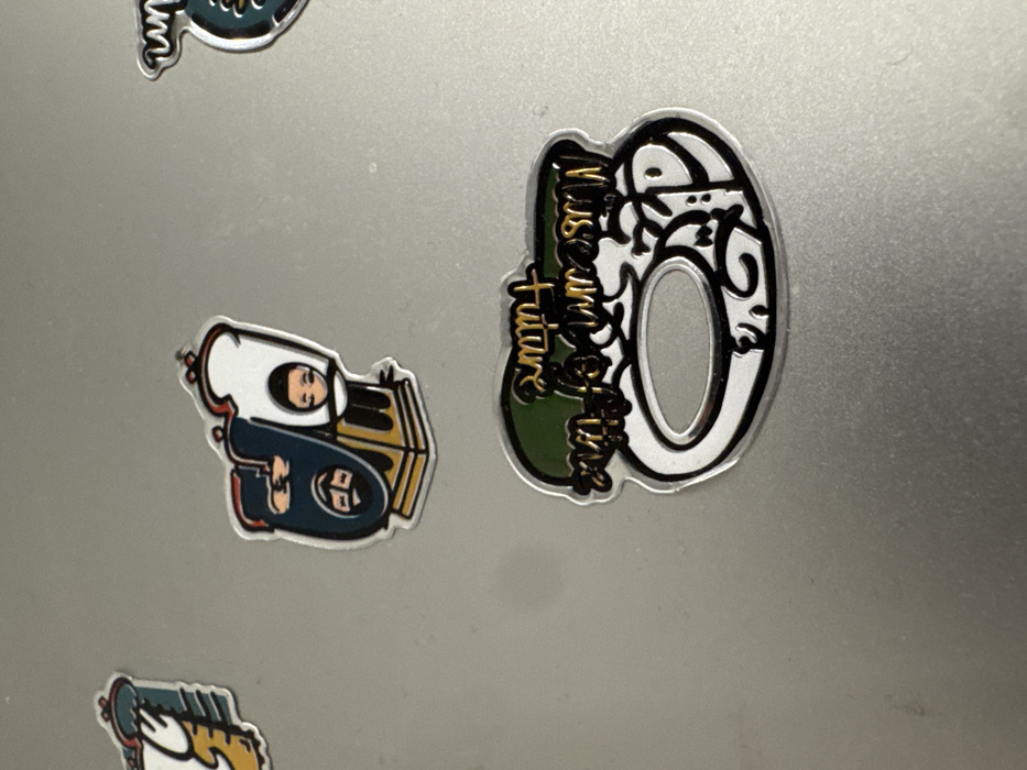 Three cartoon magnets adhere to a metallic surface. One depicts two robed figures, one above the other. The figure above has a white robe, while the figure below has a dark robe. Another magnet reads "Museum of the Future" and displays Arabic text. The third magnet is partly visible in the top-left corner and another one is only partly visible in the bottom-left corner.