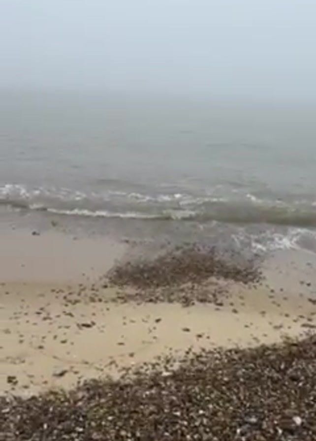 foggy beach scene. The beach is sandy with a significant amount of small rocks and shells mixed in. Small waves from the gray-toned water gently roll onto the shore. A dense fog obscures the horizon, limiting visibility out into the water. The camera slowly pans to the left, revealing more of the coastline.