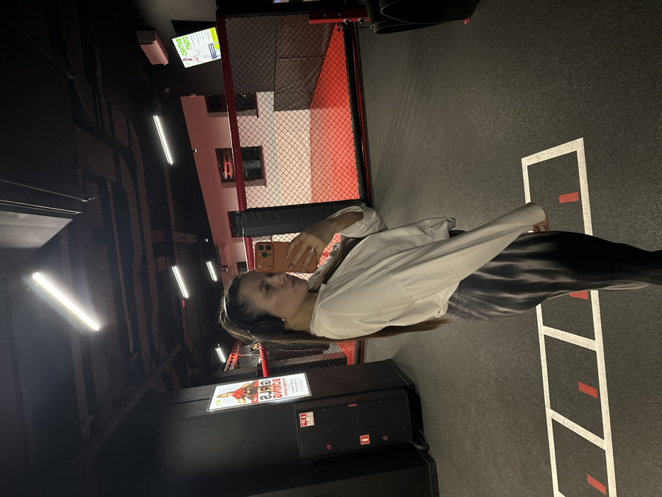 A woman in a white top and patterned leggings takes a selfie in a gym. She holds a phone in her right hand, wearing headphones. The gym features a boxing ring with a red and black cage. The floor is dark gray with white ladder markings and red stripes. Overhead, fluorescent lights illuminate the scene. A poster and storage units are visible against the wall.