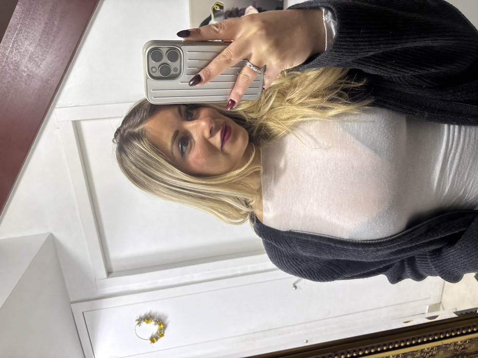 A woman poses in a mirror selfie. She wears a white top, unzipped black sweater, and has blonde hair. She holds a silver iPhone case. Her fingernails are painted dark red and black. She is wearing a diamond ring. Behind her is a white door with a floral wreath and a dark ornate frame.