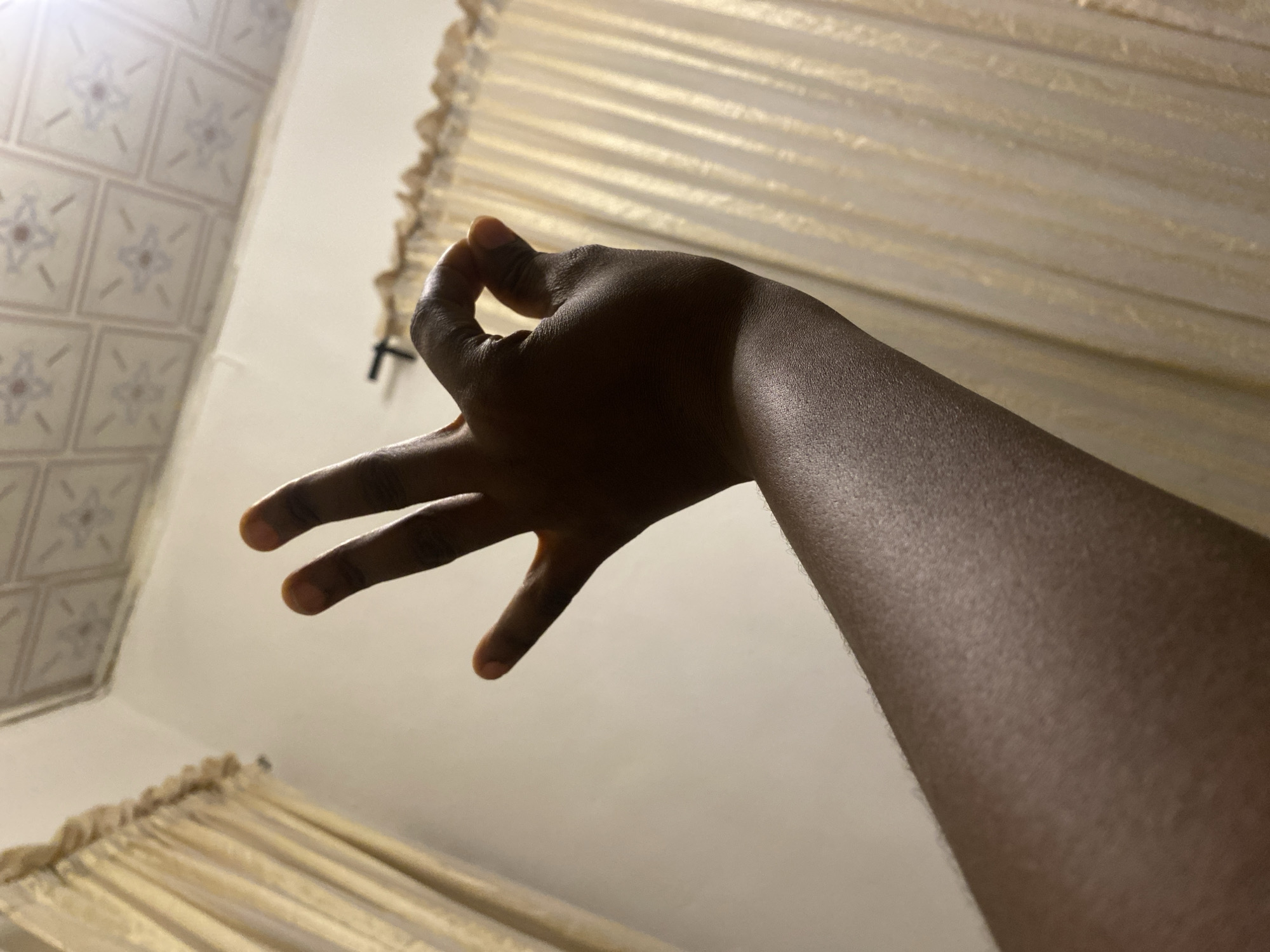 A person's dark-skinned hand is positioned to cast a shadow puppet of an animal, possibly a dog or wolf, against a plain white wall. The hand is angled upward, with the thumb and index finger forming a circular shape. The remaining fingers are extended to create the animal's ears, nose, and jaw. The background includes a textured ceiling with a repetitive floral pattern and draped, light-colored curtains. The location is likely inside a building in Nsukka, Nigeria, suggested by the style of the architecture and interior decor, but cannot be definitively confirmed from the image alone.