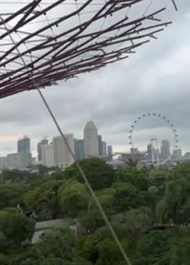 n exterior view of Singapore's cityscape on a cloudy day, as seen from the Gardens by the Bay. The camera focuses on the steel structures of the Supertrees, with visible plant growth on them. In the background, the Singapore Flyer ferris wheel and various skyscrapers are visible. The foreground consists of lush green trees and vegetation. The camera angle suggests a high vantage point, possibly from within or on one of the Supertrees.
