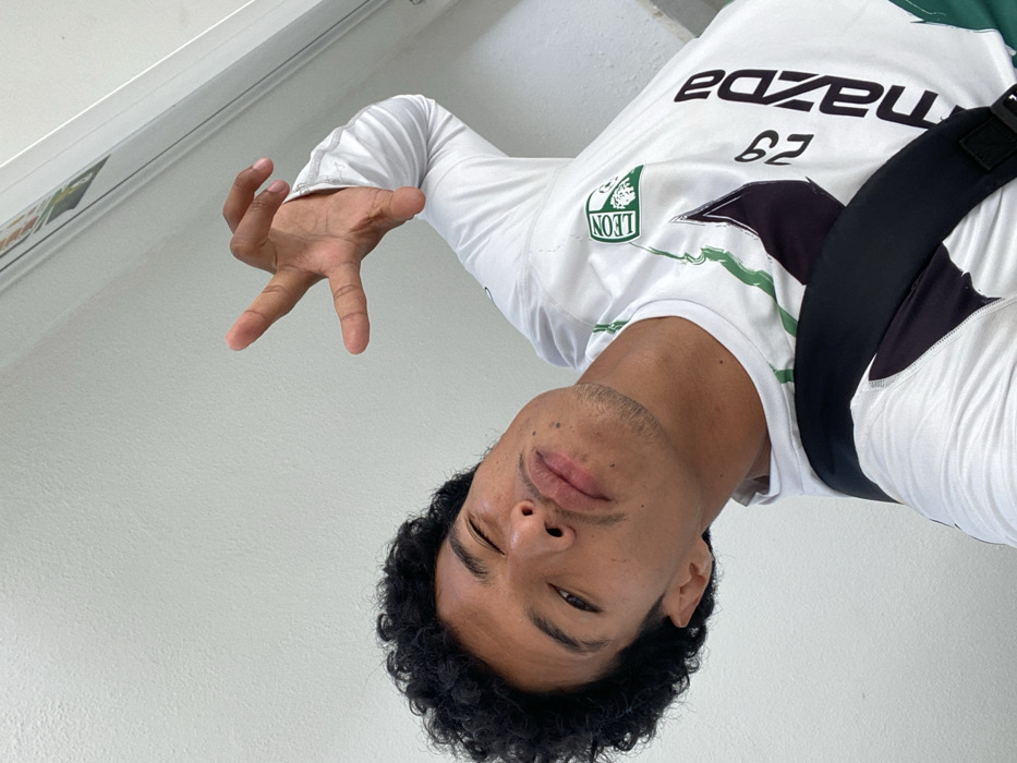 A man with curly dark hair poses, with the camera pointing down towards him. He wears a white soccer jersey with the logos of "LEON" and "MAZDA" visible, along with the number "62". He also has a black strap over his shoulder. He gives a peace sign with his right hand. The background is a white wall.
