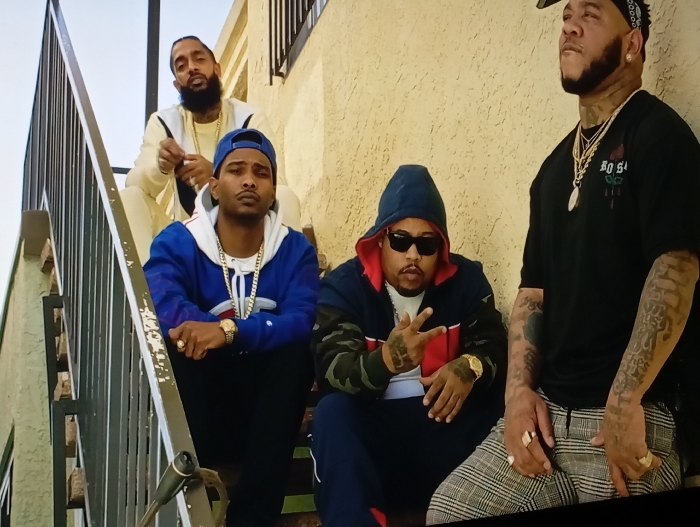 Four men pose on outdoor steps. The man at the top is bearded, with a gold chain, wearing an off-white jacket. A man in a blue jacket and cap sits one step below. Another man in a dark hooded jacket with a camouflage-patterned sleeve sits on the next step, holding up two fingers. The fourth man, bearded with tattoos, stands to the side, wearing a black t-shirt, pants and gold chains. A metal staircase runs vertically beside them. They all appear to be rappers.