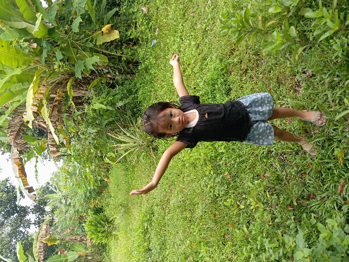 A young girl in a black shirt and patterned blue shorts lies on her back in lush, green grass, arms outstretched. She wears flip-flops. The background is filled with dense vegetation, including banana trees and various plants. The scene is sunlit, with a sense of natural vibrancy.