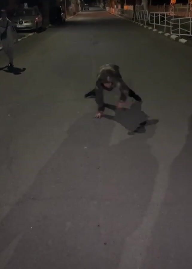 A person in a camouflage jacket and black pants is crawling on a dark street. The person falls to the ground and appears to struggle, eventually rolling over. Another person can be seen standing in the background at the beginning of the video. The scene takes place at night on what appears to be a residential street with streetlights. There are shadows cast on the road.