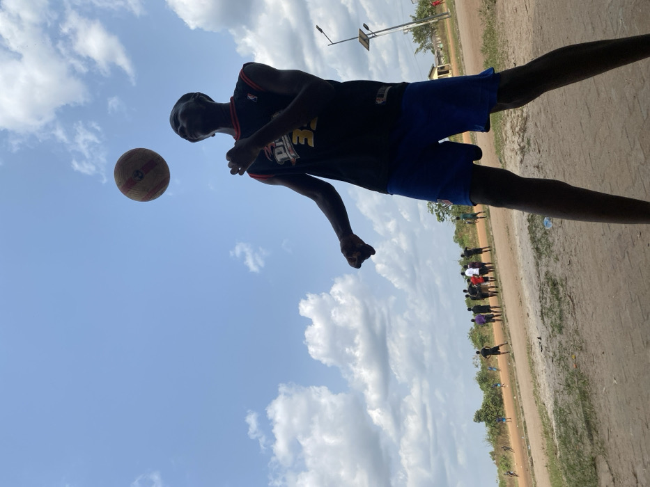 The image displays an outdoor scene in Ihiagwa, Nigeria, under a blue sky with scattered white clouds. In the foreground, a dark-skinned male subject, wearing a black sleeveless jersey with "PISTONS" and "32" visible on the front, and blue athletic shorts, is captured in an active pose. He looks upwards, with a worn, striped football suspended in the air directly above his head, suggesting an imminent heading or volleying action. His hands are clenched. The immediate ground is barren, light brown dirt. In the midground, a group of approximately fifteen individuals, mostly male, are visible on a large, open dirt field, some appearing to be engaged in a game. A line of green trees and shrubs forms the horizon line beyond the field. To the right background, a utility pole with a solar panel and a light fixture is present, with a small building partially visible behind it.