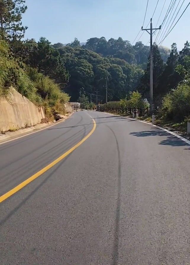 grey asphalt road winding through a rural environment. A solid yellow line marks the center of the left lane. There are tire tracks visible on the road surface. A concrete barrier runs along the left side of the road, while the right side has a grassy shoulder. Utility poles line the right side of the road. The road curves uphill and out of sight. Lush green trees cover the surrounding hills. The sky is clear and blue. A small figure on a motorcycle can be seen in the distance along the road.