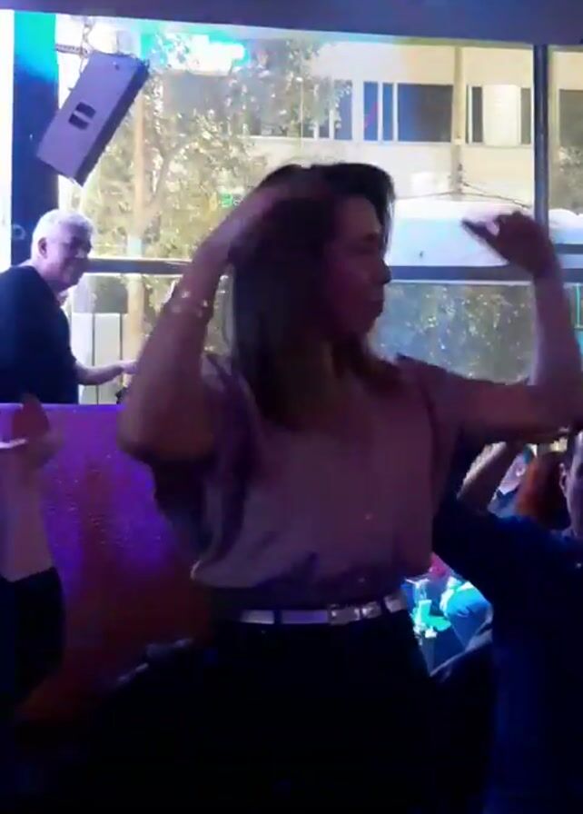 The video depicts a woman in a lilac top and black skirt energetically dancing in what seems to be a restaurant or bar