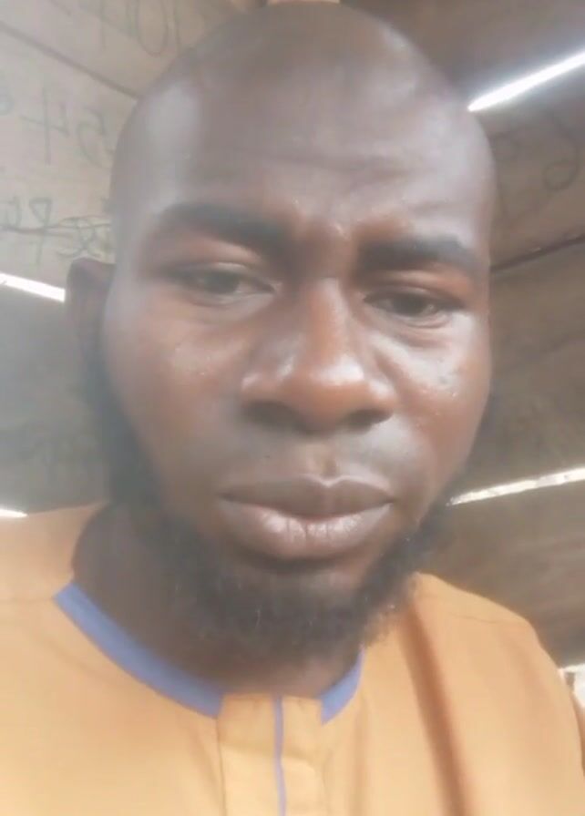 A man with dark skin, a shaved head, and a dark beard is looking directly at the camera. He is wearing a bright orange shirt with a blue collar. His lips move as if he is speaking. The background is blurry and out of focus, but appears to be some kind of structure made of light wood, possibly with graffiti or writing on it. Light is streaming through the structure from above.