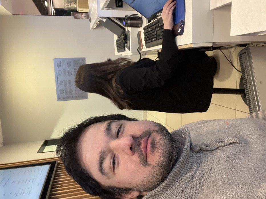 A selfie shows a man in a gray sweater with a beard. Behind him, a woman with long brown hair sits at a desk, working on a computer. A keyboard, mouse, and other electronic devices are visible on the desk. A document is pinned to the wall. A TV screen and a heater are also present in the room.