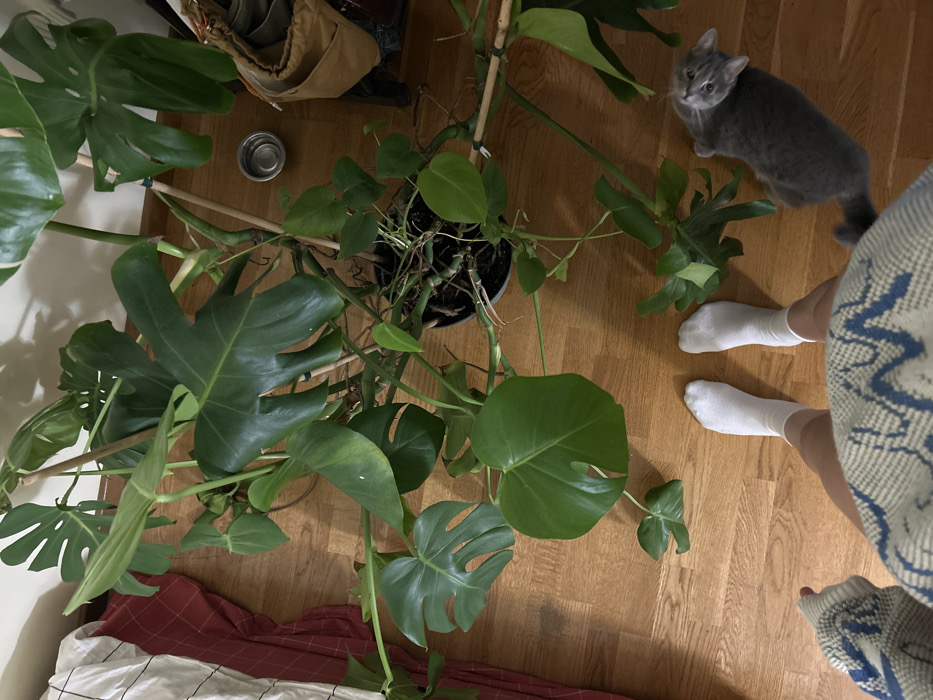 The image provides an overhead view of an indoor space featuring a light hardwood floor. In the foreground, a person's lower body is visible, wearing white socks, with a blue and white patterned garment covering their lap. To the person's right, a grey short-haired cat lies on its back, its head turned upwards. A large *Monstera deliciosa* plant, potted in black and supported by bamboo stakes, is centrally positioned. It exhibits numerous green, fenestrated leaves and smaller green vines. An empty, silver-colored metal bowl is on the floor to the right of the plant pot, beside a partially visible tan bag. A bed, featuring a white grid-patterned sheet and a red textile, occupies the far left background. A white baseboard lines the upper edge of the frame. The precise location within Dnipro, Ukraine, cannot be determined from the visual evidence.