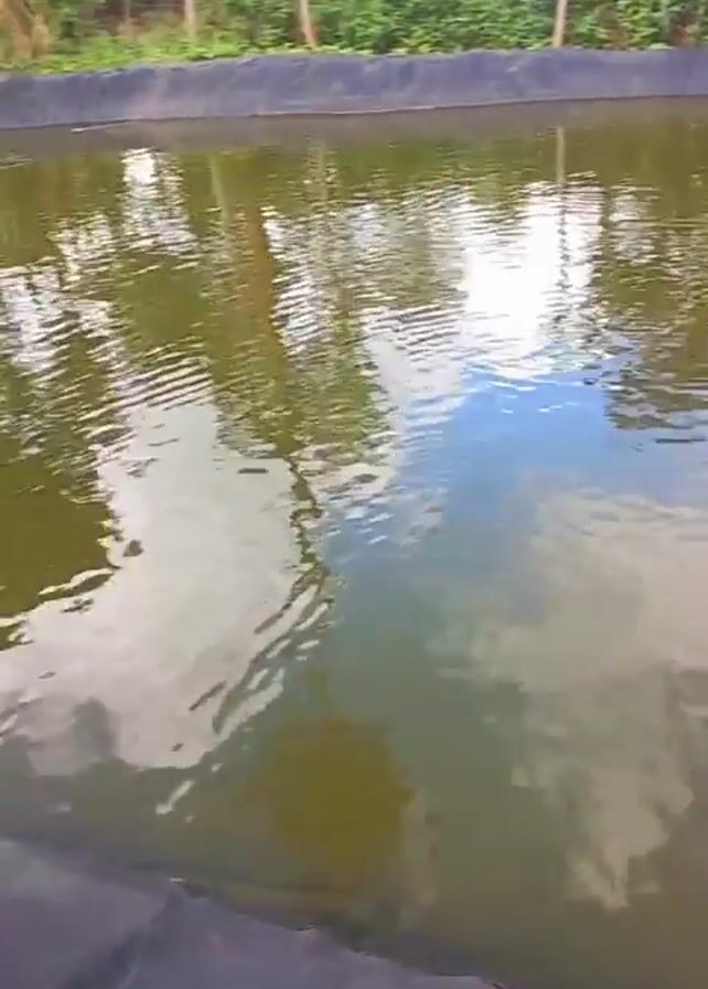 n above ground rectangular pond surrounded by a black liner. The water is tinted green and reflects the sky. The pond is surrounded by vegetation.