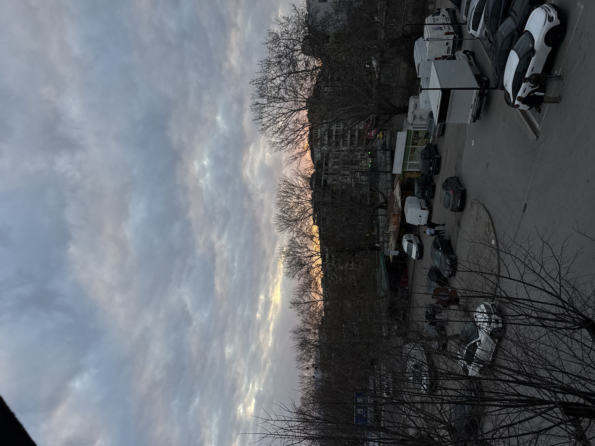 The image presents an urban scene captured in Blagoevgrad, Bulgaria, during what appears to be late afternoon or early evening. The sky is predominantly overcast with a dense layer of stratocumulus clouds, displaying a subtle gradient of orange and yellow light from a setting sun along the eastern horizon, which is partially obscured. In the immediate foreground, the leafless branches of a large deciduous tree frame the lower-left portion of the frame. The central area of the image comprises a parking lot or paved street featuring asphalt and cobblestone sections. Numerous vehicles are present, including a prominent white SUV, a white Citroen crossover, a dark grey hatchback, several dark-colored sedans/hatchbacks, and multiple white commercial vans of varying sizes, one of which is a white box truck. Two individuals are actively conversing adjacent to the white Citroen crossover in the lower-right quadrant; one wears a light-colored top and dark pants, while the other is dressed in a dark jacket and jeans. Two additional individuals are observed walking towards the right side of the frame in the upper-right parking area, near a cluster of white vans. Other blurred human figures are visible interacting or standing near vehicles and small structures in the mid-left section of the parking lot. Several small, kiosk-like market stalls, some featuring green awnings, are situated in the central midground. Behind these structures and the parking area, a dense line of bare deciduous trees extends horizontally across the frame. Beyond these trees, multi-story urban buildings of varying designs and colors rise against the horizon. The ambient light is soft and diffused, characteristic of twilight conditions.