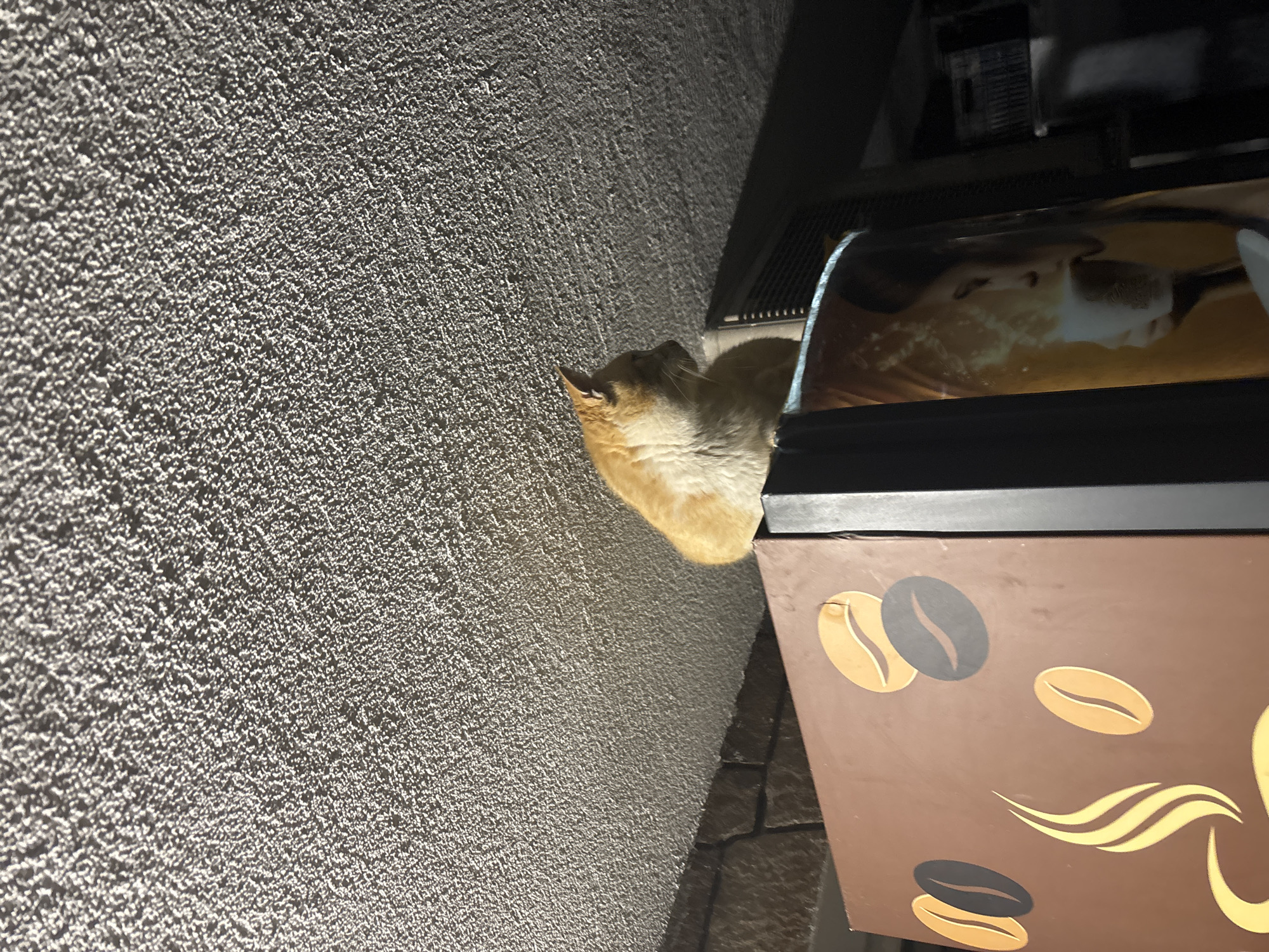 - "An orange cat is perched on a brown coffee vending machine with coffee bean designs, next to a gray textured wall" by FM-IxbI73, licensed under CC BY 4.0