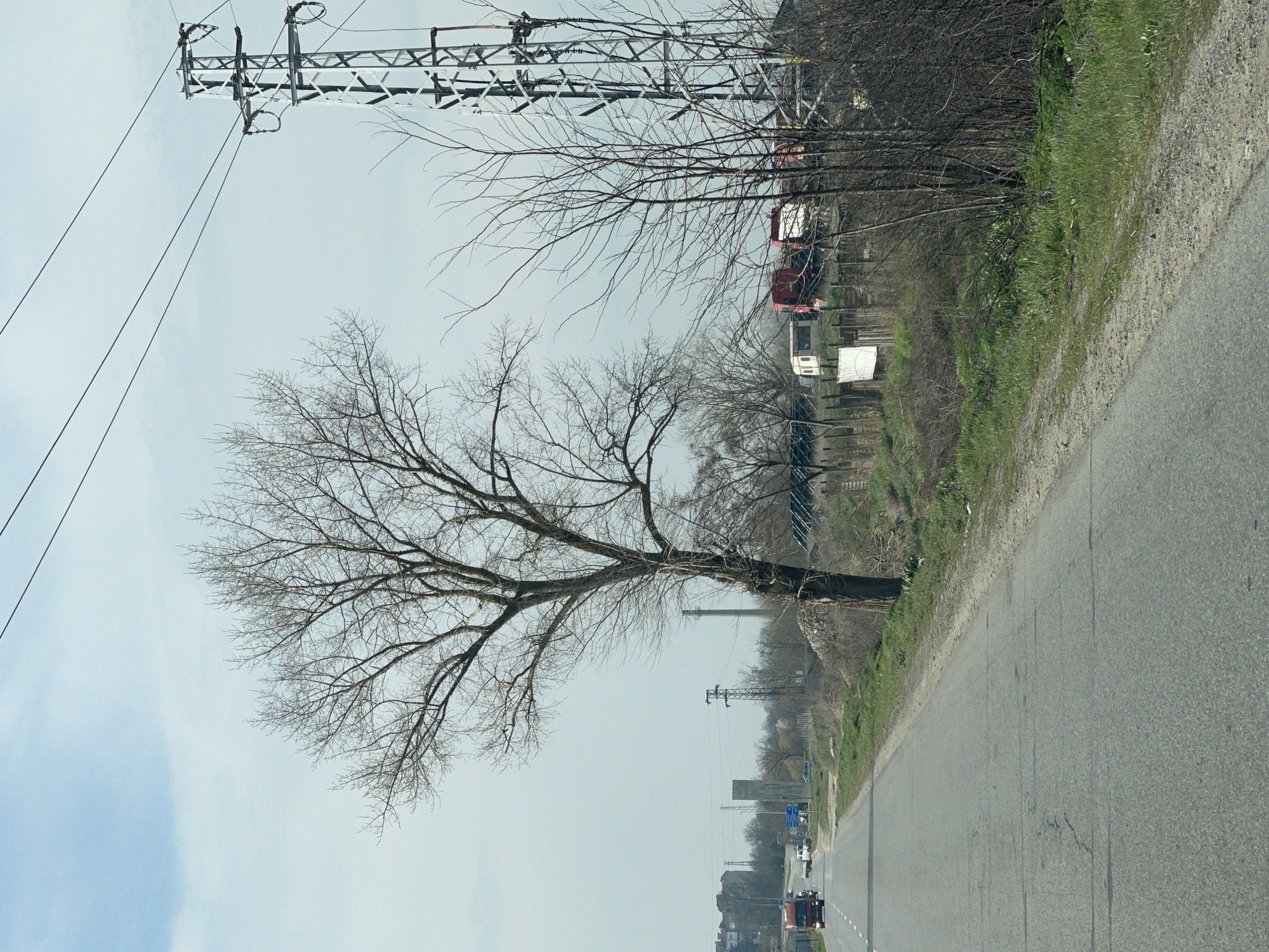 The image depicts an exterior scene in Veselinovo, Bulgaria, specifically a roadside environment under an overcast light blue sky. In the foreground and midground, an asphalt road occupies the left side of the frame, showing cracks and patches. A dirt and gravel shoulder borders the right edge of the road, transitioning into a grassy verge with interspersed dry vegetation. A large, leafless deciduous tree with a thick, leaning trunk stands prominently on the right side of the frame, its bare branches extending upwards and leftward. Further right and slightly behind, smaller bare trees and shrubs are visible. Along the road on the left, a red semi-truck with illuminated headlights travels away from the viewer. Behind it, a white van and at least one other passenger vehicle are also in motion. A blue directional road sign with white text and symbols is visible on the left side of the road in the mid-distance. A utility pole with associated transformers is present further down the road on the left. In the midground to background on the right, behind the large tree and shrubs, a wooden fence is present. Affixed to this fence is a white rectangular banner or sign, the content of which is illegible. Beyond the fence, several structures are identifiable: a white trailer or modular unit, two red truck cabs, and a white truck cab. A dark-colored roof structure, possibly a shed or greenhouse, featuring what appear to be solar panels, is also visible. Piles of light-colored rubble and debris are situated behind the large tree. Dominating the far right side of the frame is a tall, metal lattice-work electricity pylon, extending upwards and supporting multiple dark overhead power lines that traverse the sky from left to right. In the far background on the left, a cluster of low-rise buildings, a tall concrete structure, and a slender industrial chimney or smokestack are visible, indicating an industrial or semi-urban area. No people are visible within the frame.