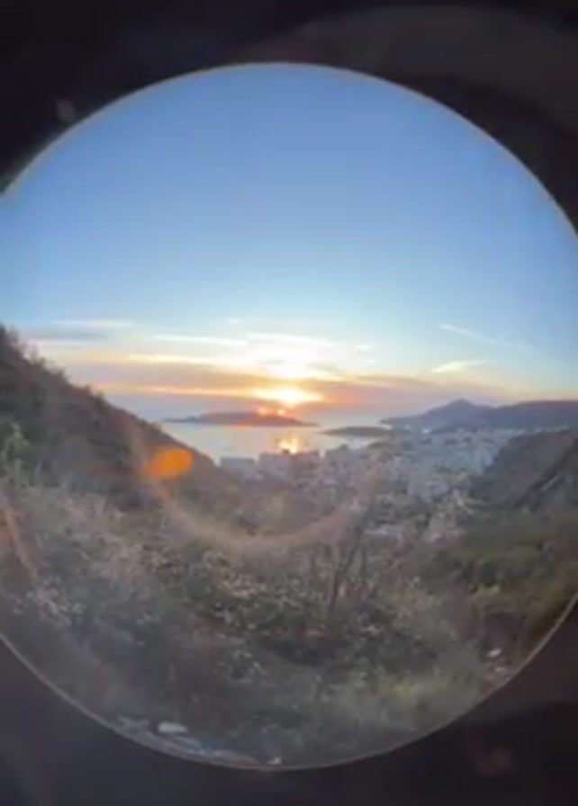 A fisheye lens shot reveals a sunset scene. The sun is setting over a bay with islands, reflecting orange light on the water. A coastal city sits along the edge of the bay. The foreground is dominated by a hillside covered in vegetation, with a path visible. The sky is a clear blue, with contrails from planes visible. Several lens flares are present in the video.