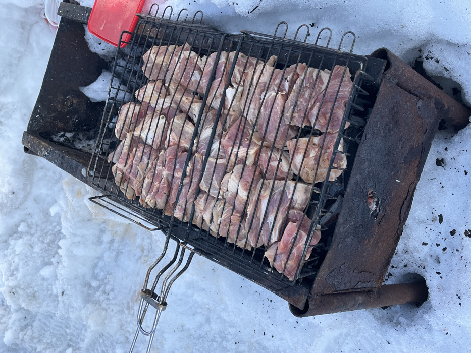 The image depicts an outdoor cooking setup in a snowy environment, likely in Зипуново, Russia