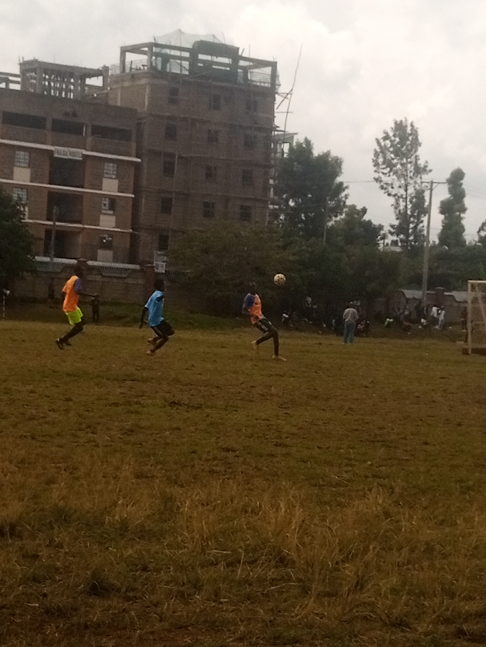 The image depicts an outdoor football (soccer) scene in Karingani ward, Kenya, under an overcast sky