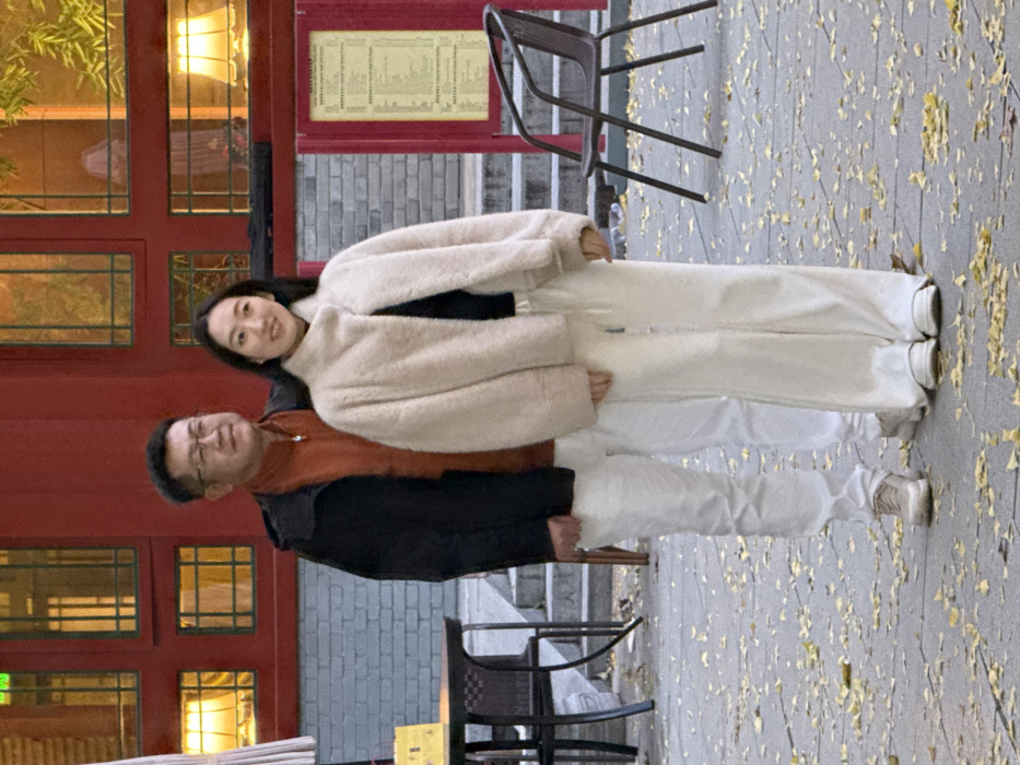 Two individuals, a middle-aged male and a young adult female, are standing outdoors on a paved surface in Xicheng District, China