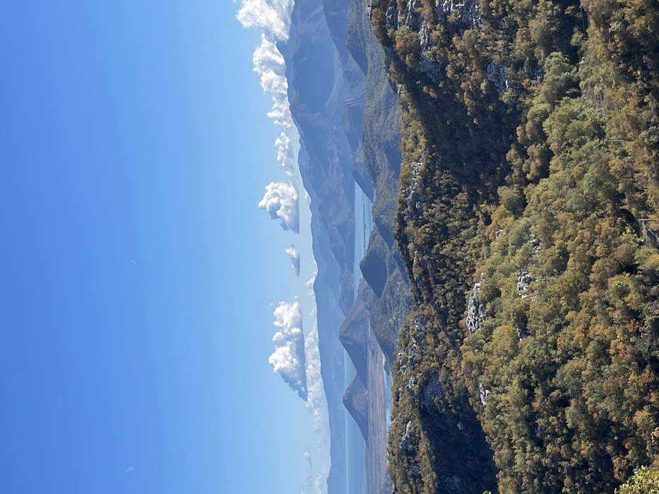 The image depicts an expansive panoramic landscape captured from an elevated position in the vicinity of Gornja Brova, Montenegro. The upper third of the frame shows a clear blue sky. A faint crescent moon is visible in the upper-left quadrant, and a thin, white aircraft contrail appears in the upper-right. Scattered white cumulus clouds are present above the distant mountain range. The mid-ground features a large body of water, identifiable as Skadar Lake, with distinct conical hills rising from or adjacent to its surface. Areas of lighter-colored marshland are discernible within the lake region. Beyond the lake, multiple layers of mountains recede into the distance, appearing in progressively lighter shades of blue. The foreground and mid-ground hills are densely covered with mixed deciduous and evergreen foliage, displaying autumnal hues of green, yellow, and brown. Numerous exposed patches of light-grey rock formations are visible on these forested slopes. No individuals, animals, or prominent man-made structures are present in the scene.