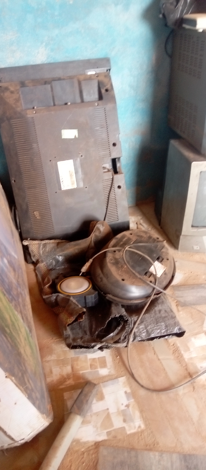 The scene depicts an indoor area in Rido, Nigeria, containing several electronic devices and significant dust accumulation. A light blue painted wall serves as the background. Leaning vertically against this wall on the left is the dark grey rear casing of a flat-panel television or monitor, displaying ventilation grilles and multiple white adhesive labels. To the right, two light-colored, older-model cathode-ray tube (CRT) televisions or monitors are stacked vertically against the same wall, appearing coated in dust. On the tiled floor in the foreground, beneath the leaning flat-panel unit, are electronic components. These include a circular speaker driver with a light-colored cone and a gold-toned surround, mounted on a black square base, and an inverted, dark-colored circular speaker or electronic housing from which a grey cable extends. These components rest on a dark, textured, possibly torn, fabric or plastic material. The floor is tiled with a pattern of light brown and off-white squares, largely covered by a thick layer of light brown dust or sand. A long, light-colored, possibly wooden, object lies diagonally on the lower left portion of the floor. No individuals are present.