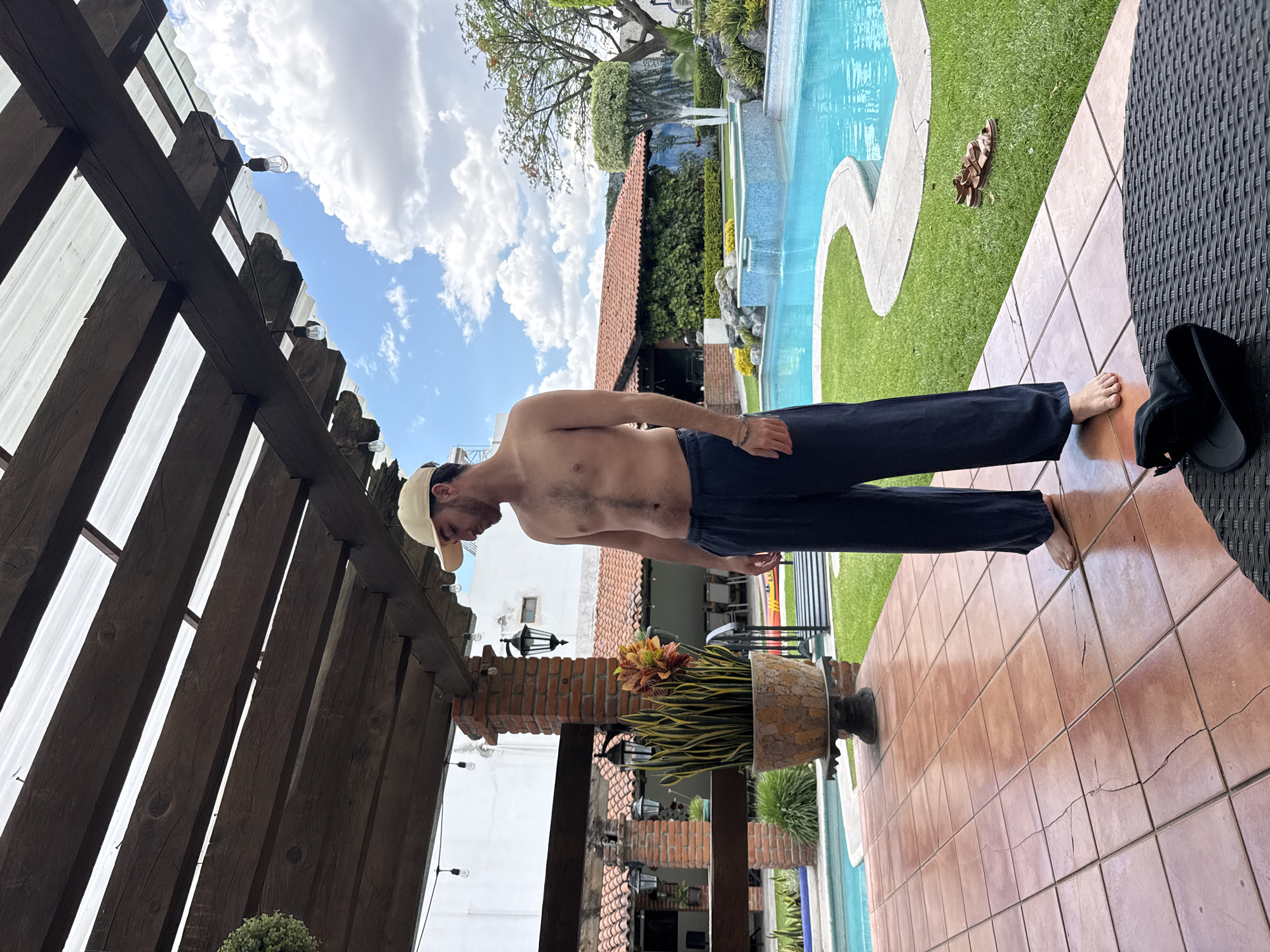A shirtless man wearing black pants and a beige baseball cap is standing on a tiled patio next to a swimming pool. The patio is adjacent to a manicured lawn and a house with a red tile roof. A large potted plant sits on the patio. A wooden pergola is visible overhead, and black shoes are on the patio floor. The location is potentially in a residential area in Puebla, Mexico.