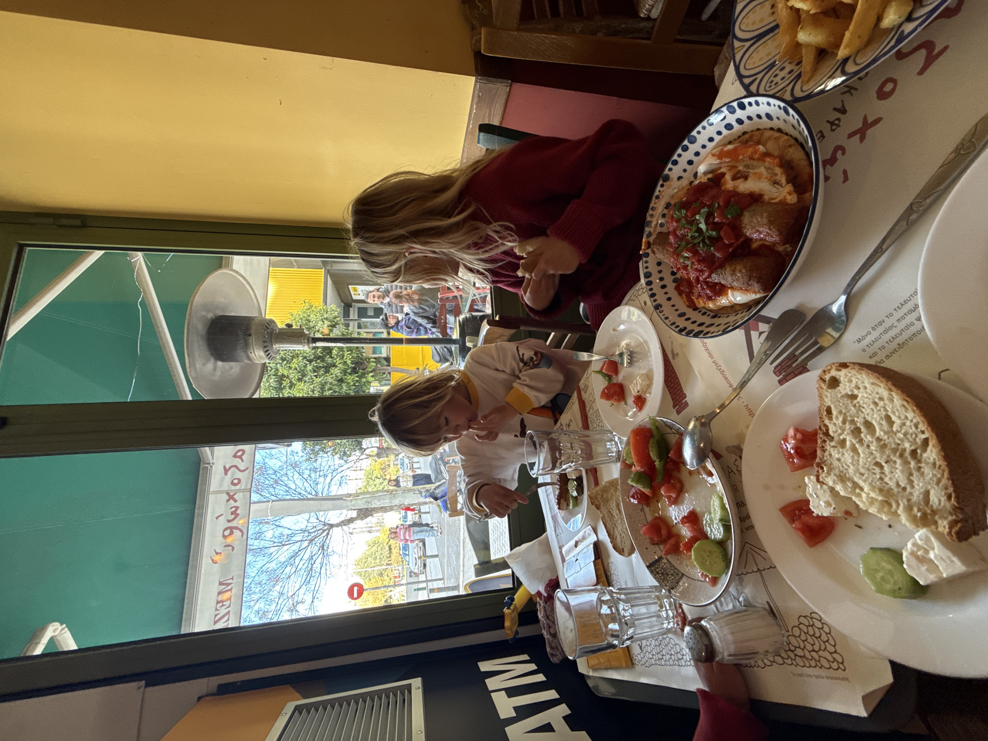 restaurant table in Athens, Greece. Two children are seated at the table, eating. One child is wearing a red shirt, and the other is wearing a white shirt. Various plates of food are on the table, including fries, a dish with tomato sauce and sausage, and a plate with bread, tomatoes, cucumbers, and feta cheese. The table is covered with a paper placemat with Greek text. Outside the restaurant window, people are walking on the sidewalk, and trees line the street. The restaurant has a sign written in Greek. An ATM sign is visible at the bottom left of the image.