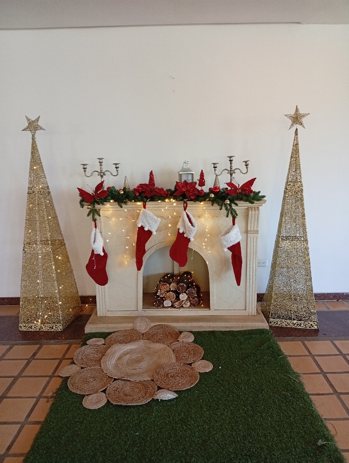 This image depicts an indoor Christmas holiday display in Pedro González, Venezuela. A light-colored decorative fireplace mantelpiece is centered against a plain white wall. The mantelpiece is adorned with an evergreen garland featuring red poinsettias, red berries, golden ornaments, and warm white string lights. On the mantel, two silver candelabras flank a white lantern and several small red and golden decorative elements. Five Christmas stockings, alternating red with white cuffs and white with red cuffs, hang from the mantel. The firebox opening contains a stack of artificial logs, internally illuminated to simulate embers. Flanking the fireplace are two symmetrical, tall, golden, conical open-frame structures, each topped with a star and illuminated by internal string lights. The floor in front of the fireplace is covered by a rectangular section of green artificial turf. Placed on the turf is a circular arrangement of various-sized woven straw or rope mats. The surrounding floor consists of light brown square tiles. No individuals or active interactions are present in the scene.