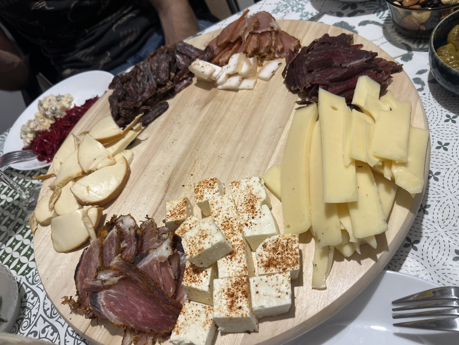 A circular wooden serving board, laden with various food items, occupies the center of a dining table in Sofia, Bulgaria