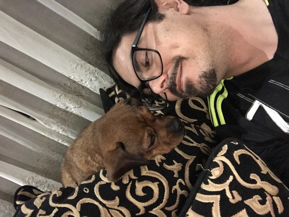 The image depicts an adult male and a dog in an indoor residential setting within Johannesburg, South Africa. The man, positioned on the right side of the frame, has dark hair, a goatee, and a mustache, and wears black-framed glasses. He is dressed in a black short-sleeved shirt featuring neon yellow/green stripes on the shoulders and a white diagonal graphic on the chest. His expression shows a slight smile, with his gaze directed upwards and to the right, consistent with taking a selfie. Adjacent to him, a small to medium-sized brown dog with short fur is resting its head on a black cushion decorated with a gold scrollwork pattern. The dog's eyes are partially closed and directed downwards. Another cushion with the identical pattern is visible in the lower-left foreground. The background reveals light-colored, pleated curtains exhibiting a subtle floral or embroidered design. The subjects are in close proximity, indicating a domestic interaction.