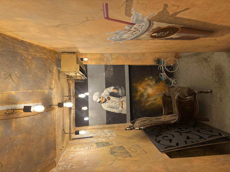 The image displays an interior space, identified as "Cafe Daze" from a wall mural, characterized by heavily textured, cracked orange-brown walls and a darker, similarly textured ceiling, located in Dhaka, Bangladesh