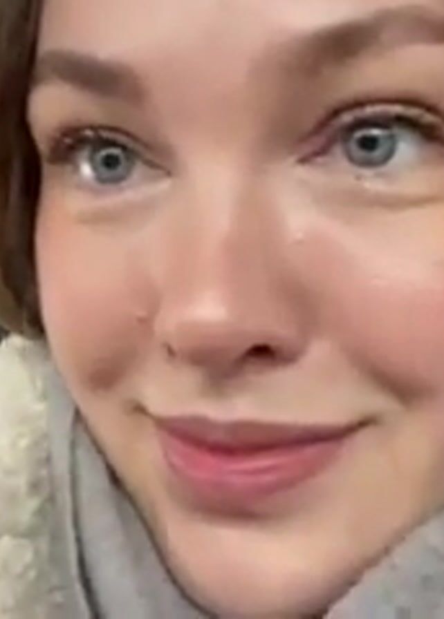 A young woman is recording a video of herself in what appears to be a subway car. She has blonde hair, blue eyes, and fair skin. She is wearing a white, fluffy jacket and a light gray scarf. Behind her is a subway door, with a sign in Russian that says "Не прислоняться," which means "Do not lean." Other people are visible in the background. The video is shot from a close-up angle, focusing on the woman's face. She is smiling and appears to be talking. The lighting is bright and even.