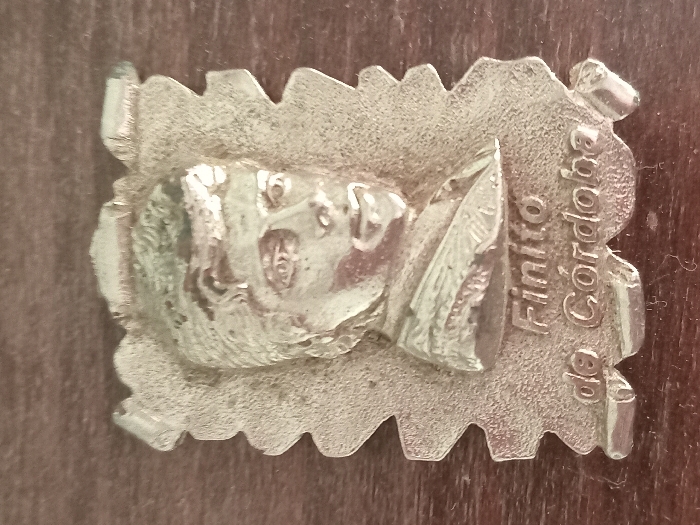 A silver-toned metallic badge, approximately rectangular with an irregular, scalloped perimeter, rests on a dark, textured wooden surface. The badge features a raised relief bust of a male figure in profile, facing right. The figure is depicted with wavy hair, distinct eyes, a nose, and lips, and appears to be wearing a collared garment. Below the bust, the embossed text "Finito de Córdoba" is displayed in two lines. The metallic object exhibits a slightly dull, textured finish with minimal reflectivity. The wooden background displays horizontal grain. The image provides no visual information regarding its location in the city of Meknes, Morocco.