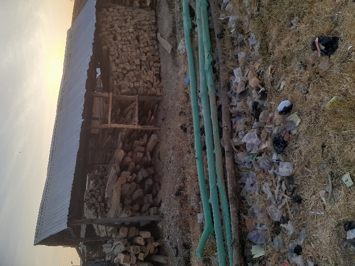 A shed with a corrugated metal roof shelters stacks of lumber. Three green painted poles and an unpainted log lie next to it on the ground. Litter, consisting of plastic bags and other debris, is scattered across a field of dried grass. The horizon is illuminated by the setting sun. The picture is taken from an angle, rotated sideways.