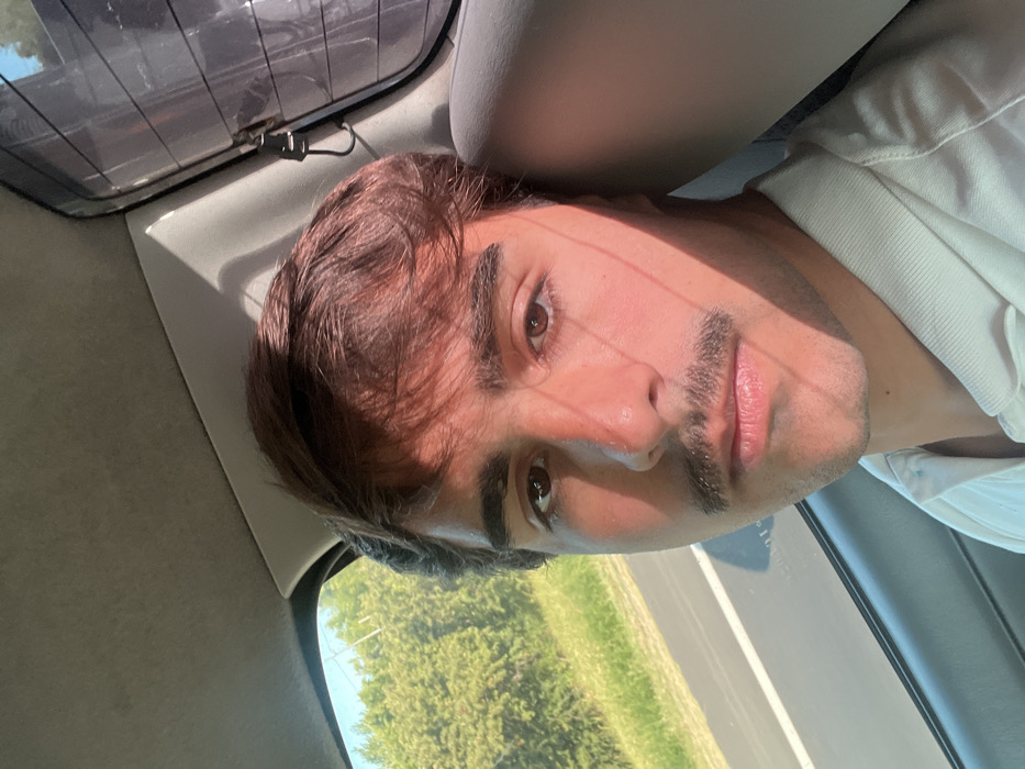 A man poses inside a vehicle. He has brown hair and brown eyes, and a mustache. He wears a white polo shirt. Sunlight illuminates his face from the right side, casting a shadow across his nose and cheek. A partially visible roadside landscape appears through the window. The car's interior includes a grey headrest and a sunshade on the back window.