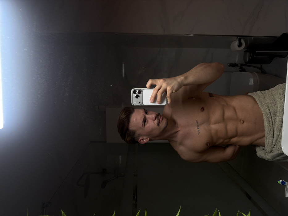 The image displays a male subject taking a mirror selfie in a modern bathroom