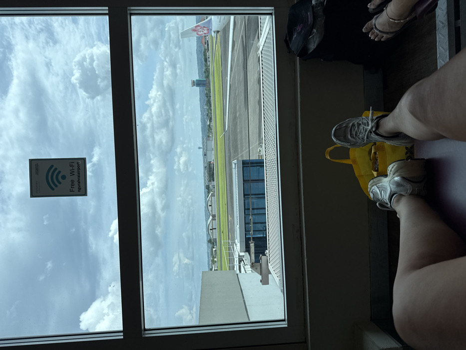 From an airport window, a view encompasses a runway, an airplane tail fin, and a control tower under a partly cloudy sky. A "Free Wi-Fi ngurahraiairport" sticker is on the window. Inside, a pair of legs wearing athletic shoes and another pair of feet in sandals are visible. A yellow bag and a black bag are nearby. The shot appears to be taken at Ngurah Rai International Airport.