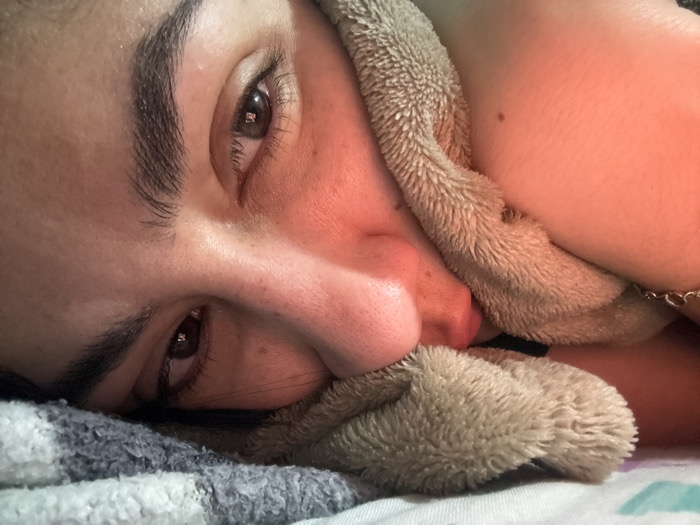 - "A close-up captures a woman lying down, her face partially obscured by a fluffy, light-colored towel held near her mouth" by FM-rSR2K3, licensed under CC BY 4.0