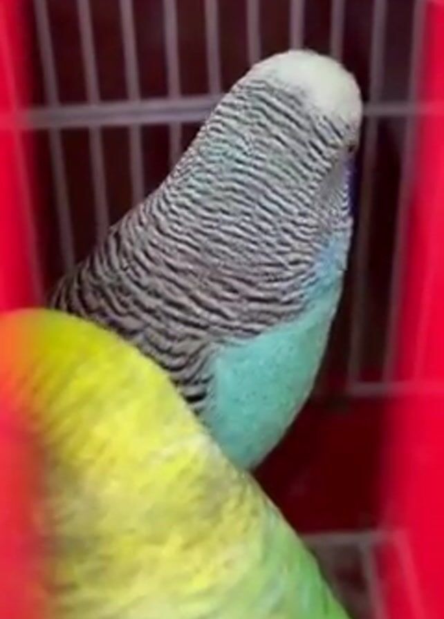 Inside a red birdcage, a budgie with a white head, black and gray striped back, and light blue chest rests on a yellow and green object. The budgie briefly looks directly towards the camera after it whistles.