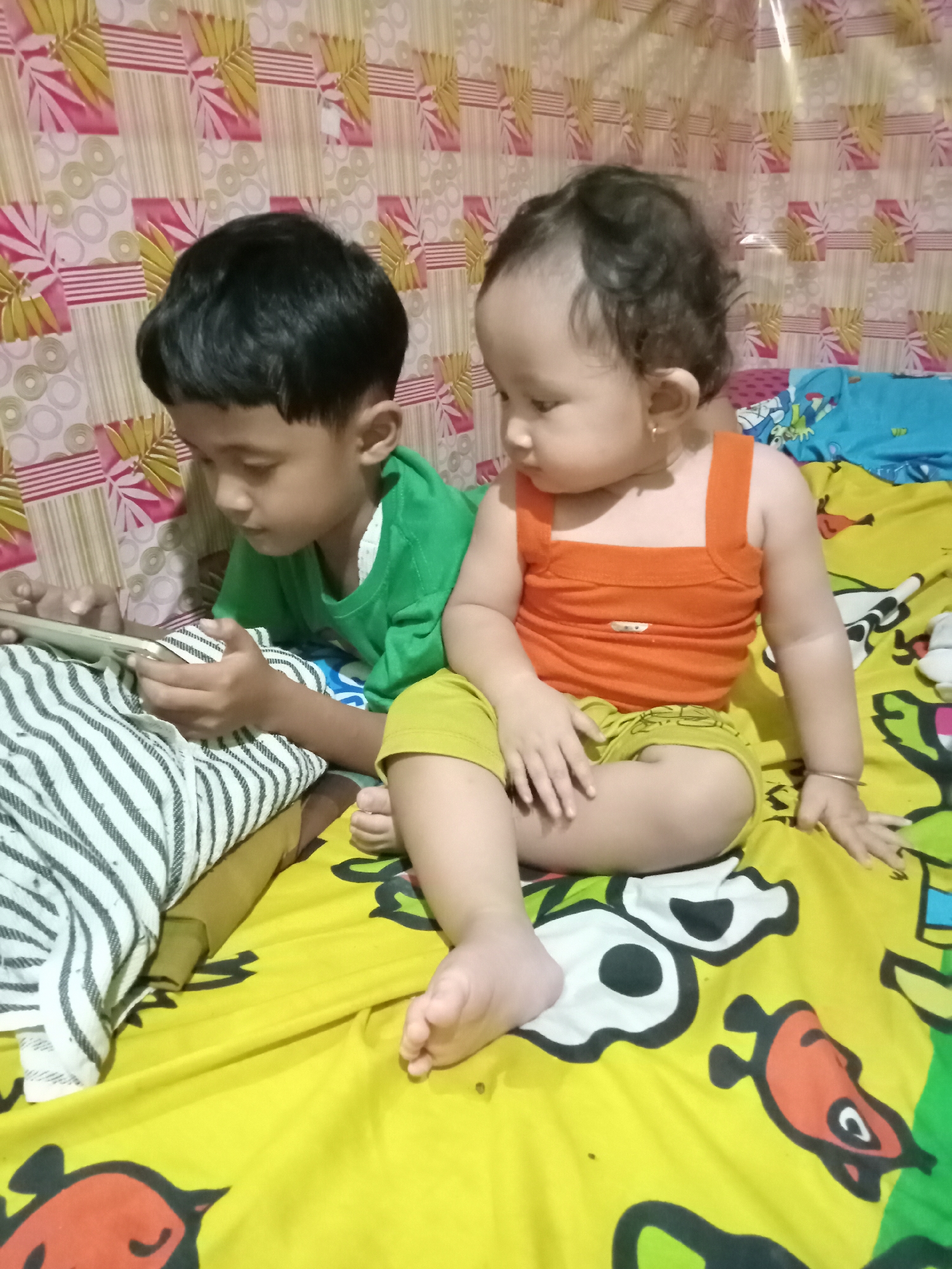 This image, taken in Bungur, Indonesia, depicts two young individuals indoors, situated on a bed. The scene is dominated by a yellow bedspread adorned with multiple colorful cartoon character designs. A wall behind them features a patterned wallpaper with geometric and floral motifs in shades of pink, red, yellow, and beige. To the left, an older child, identified by short, dark hair and wearing a green short-sleeved shirt with a visible white collar, is lying on their stomach or side. This child is holding a light-colored smartphone with both hands, orienting it horizontally, and appears to be actively viewing its screen. A striped white and black textile object, possibly a pillow or folded blanket, is positioned beneath the child's left arm and the phone, with a brown or olive-green fabric visible underneath it. To the right, a younger child, an infant or toddler with dark, curly hair, is seated upright or semi-reclined. This child is dressed in an orange tank top and lime green shorts. A small gold-colored earring is present in the child's visible right ear, and a thin gold-colored bracelet is on the left wrist. The younger child's gaze is directed slightly to the left and downward, not directly at the smartphone or the older child. Another section of bedding, possibly a blue sheet with cartoon patterns, is visible behind the younger child on the right side of the frame.