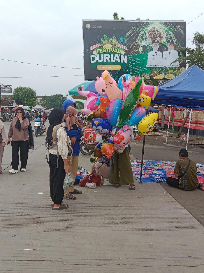 A scene outdoors depicts people near a banner advertising a "Festival Durian." A woman in a hijab stands holding a baby, alongside another woman wearing a backpack. A person holds a large bunch of colorful cartoon-shaped balloons. A man sits on the ground near a blue tarp displaying merchandise. Another woman, wearing a hijab and a brown sweater, walks away. There are motorcycles and tents in the background.